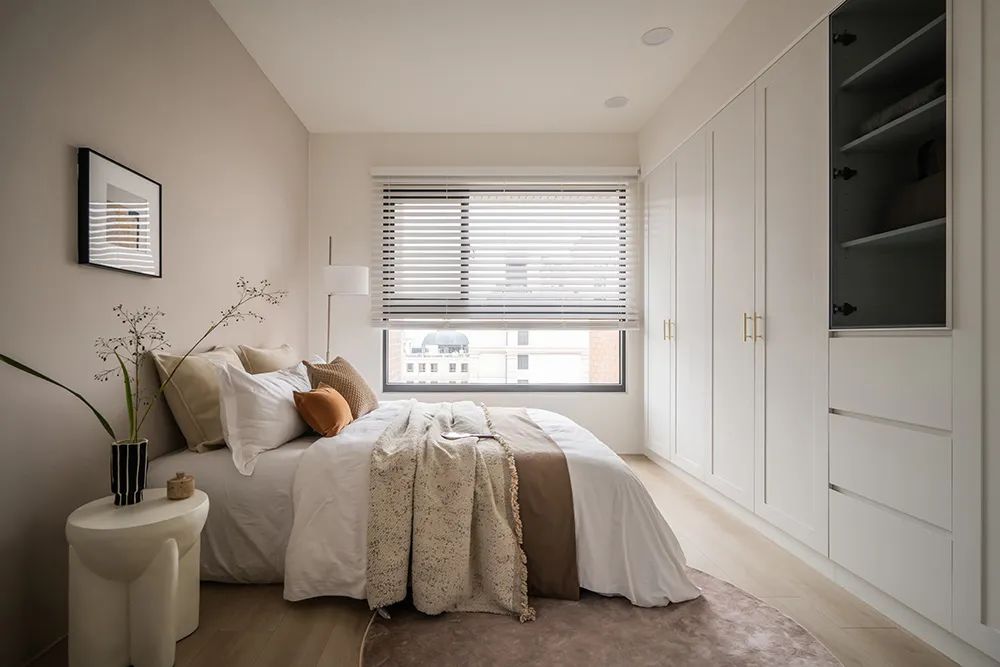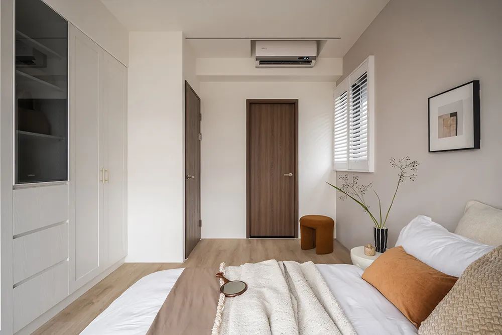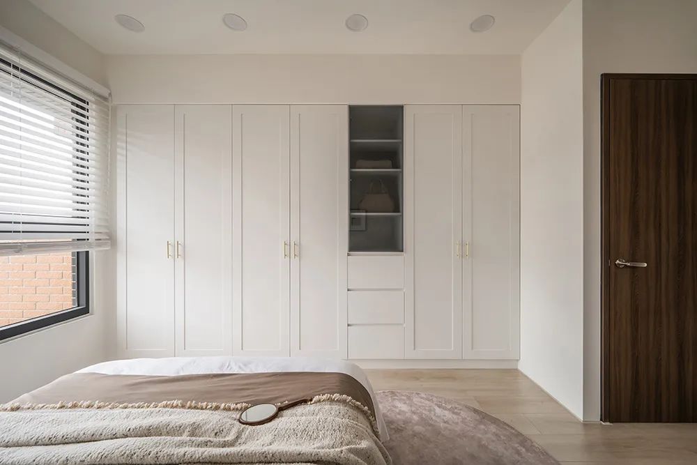 主臥空間不大,所以先做了一個(gè)容量足夠的衣柜,用美式線條裝飾,可以收納夫妻倆的衣物和換季的床品。