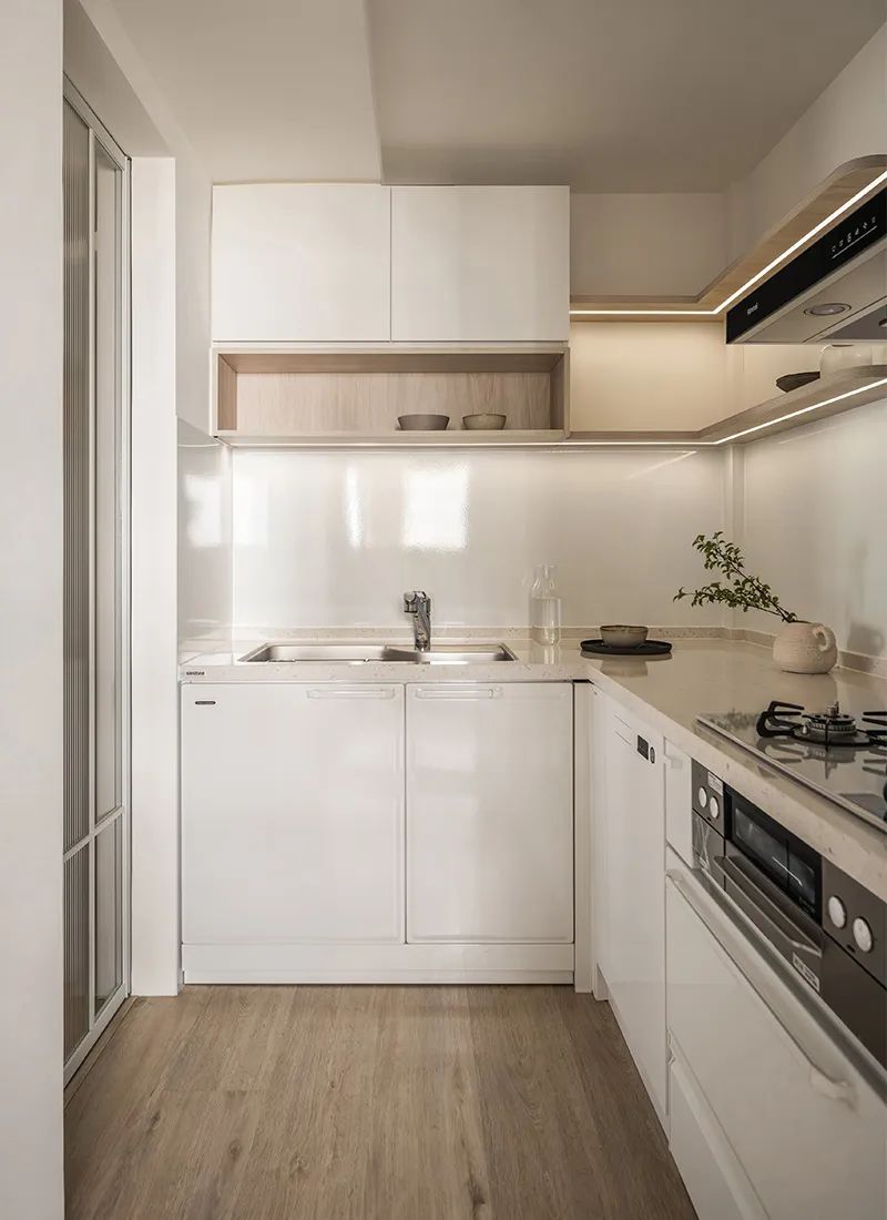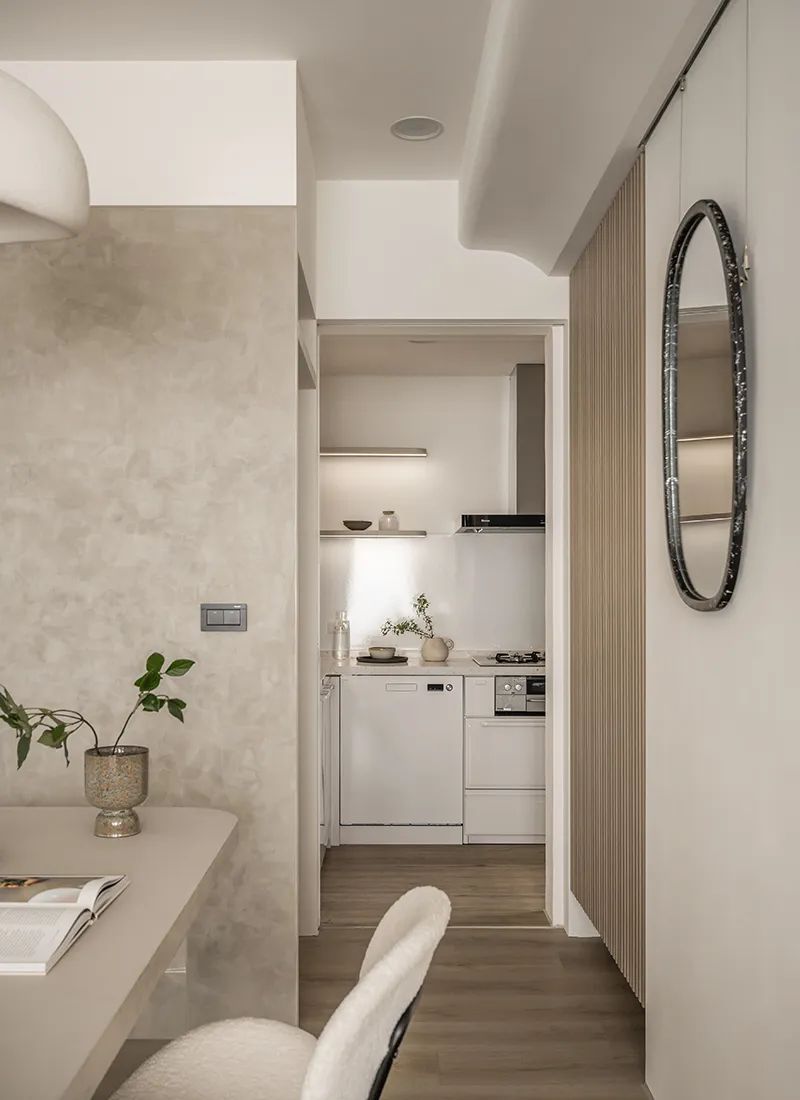 進(jìn)門后左側(cè)用木作墻體隔開廚房,內(nèi)置冰箱,并延續(xù)玄關(guān)涂料,色調(diào)統(tǒng)一,空間更顯寬敞。