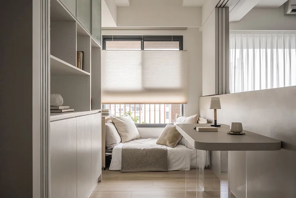 同樣的設(shè)計(jì)還用在了書房。不管你從玄關(guān)還是客廳看過去,都能感受到空間的通透感。