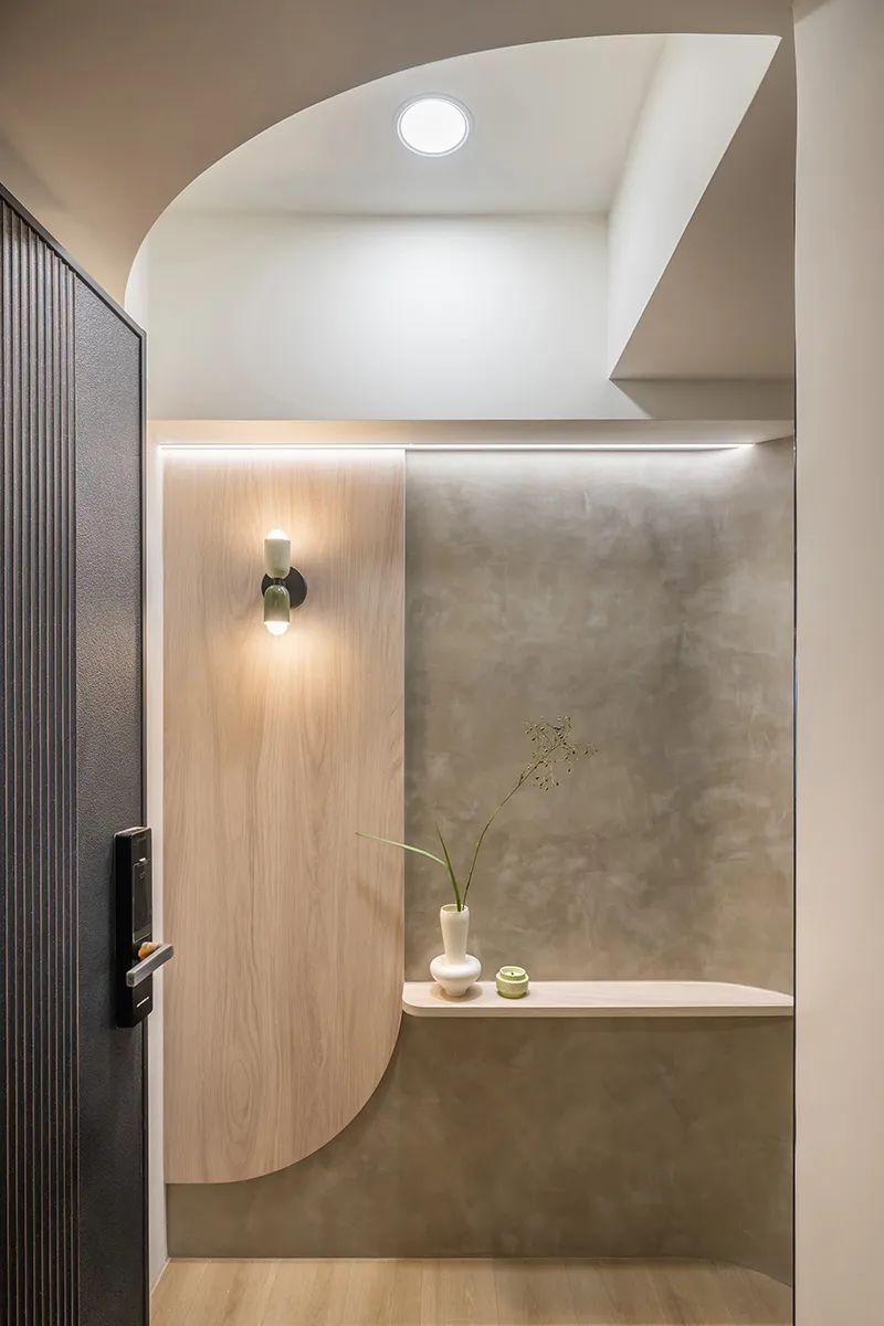 為了讓空間不顯得壓抑,左右兩側(cè)都留了空白,還做成了弧形,可以用來放綠植點(diǎn)綴。