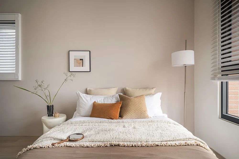 床頭的墻面刷了進(jìn)口品牌的涂料,沒有做復(fù)雜的床頭造型,讓人更容易放松心情,睡眠區(qū)也顯得安靜舒適。