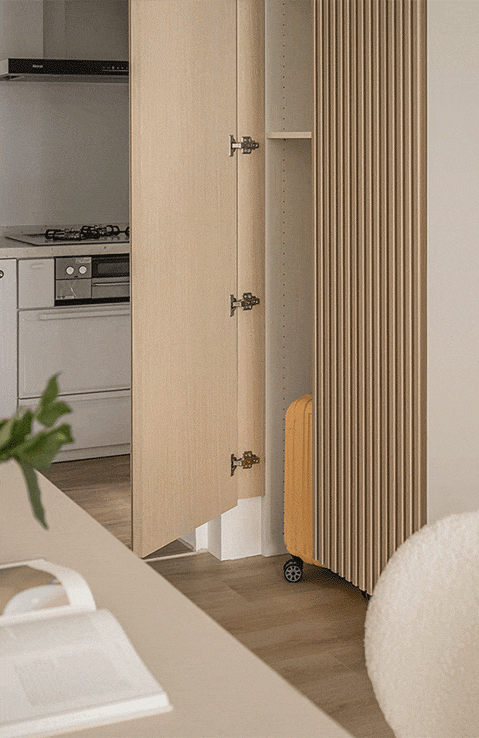 柜子兩邊對(duì)稱,里面還設(shè)計(jì)了一個(gè)儲(chǔ)藏室。柜門用的是帶凹凸感的木質(zhì)格柵板,配上白色的墻面,讓空間更有層次感。