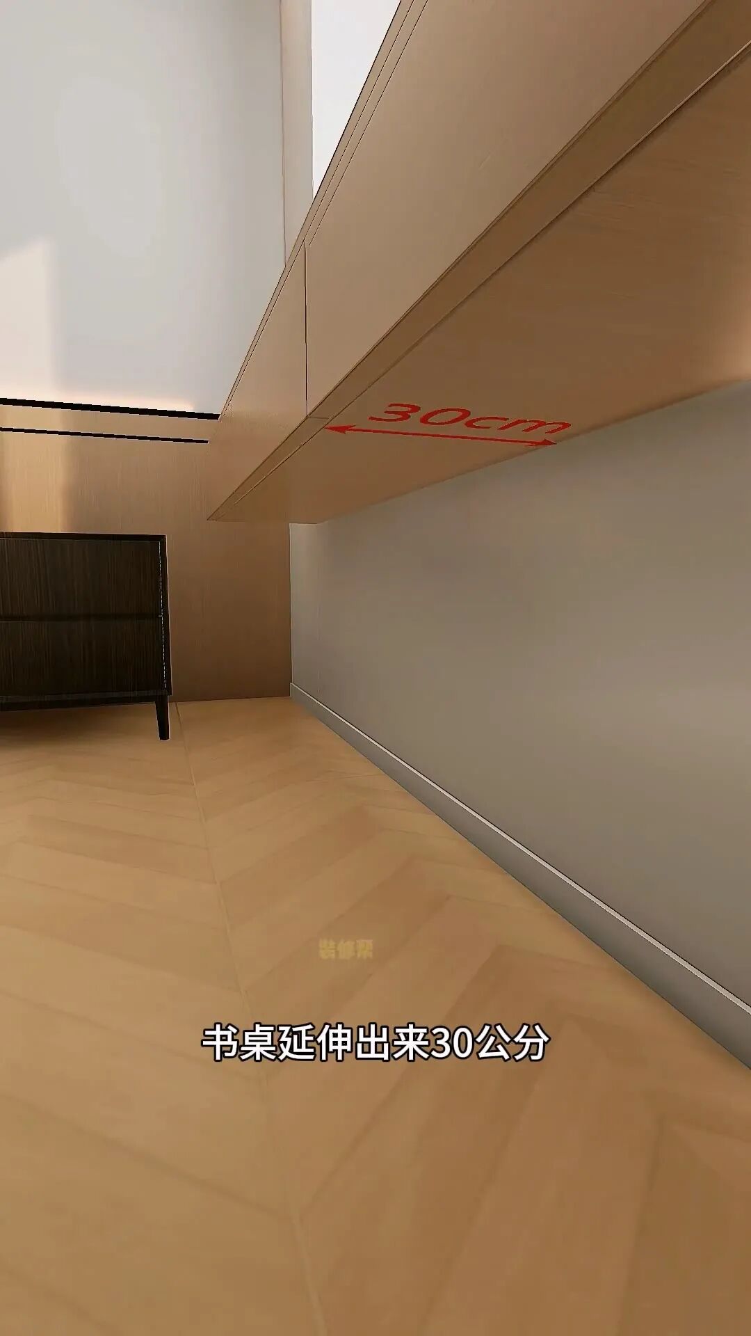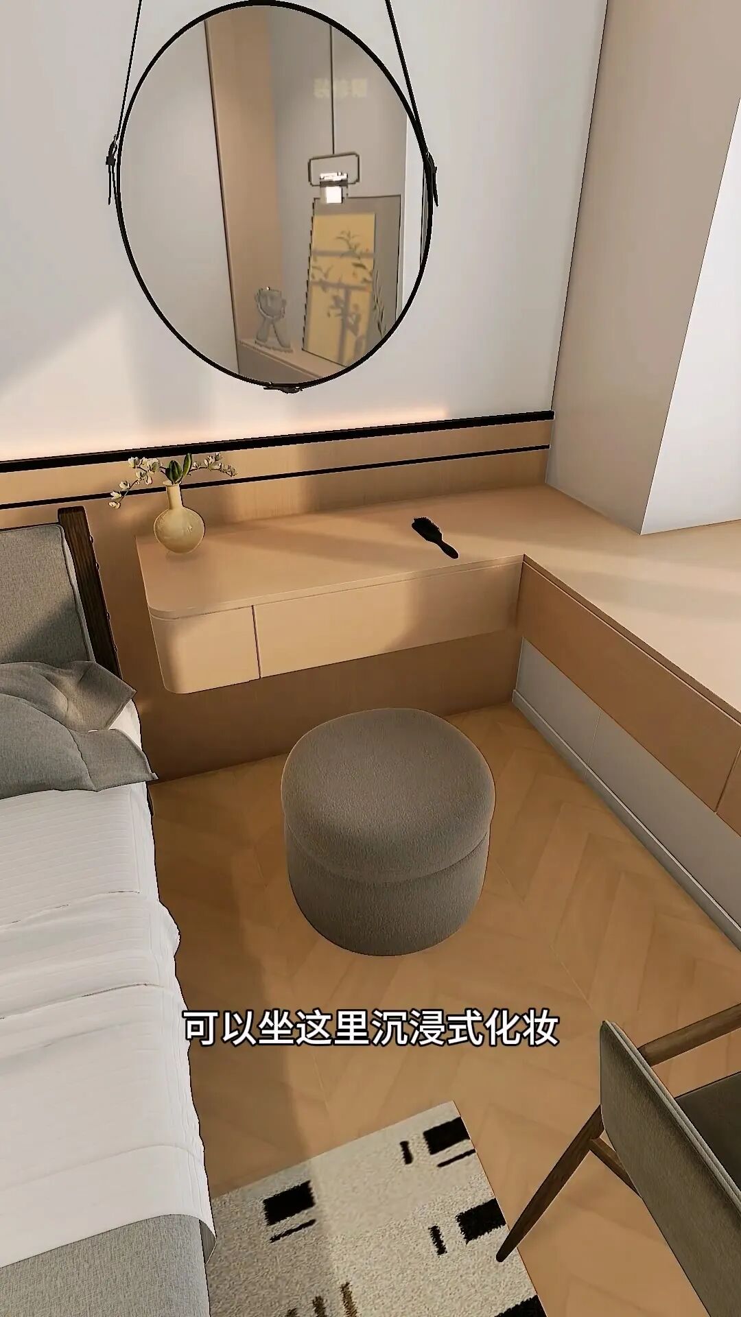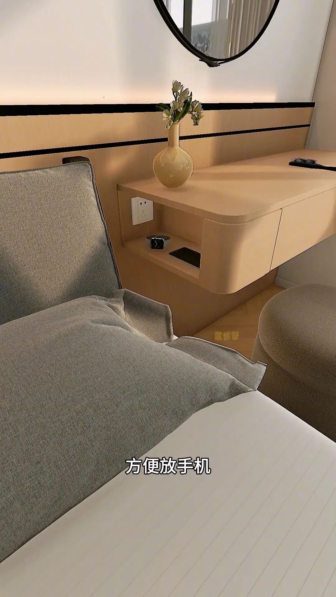 扔掉一邊的成品床頭柜,延伸出轉(zhuǎn)角化妝桌,媳婦可以坐這里沉浸式化妝,精致每一天,側(cè)邊挖個15公分的洞,方便睡前放手機