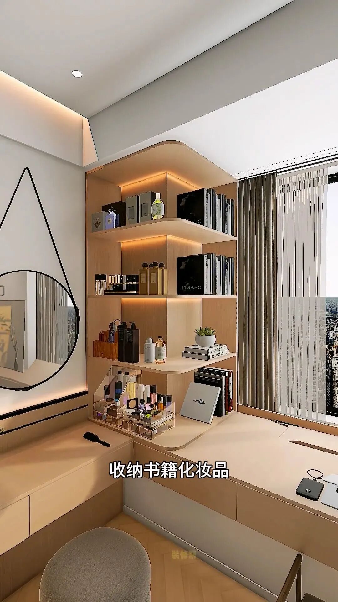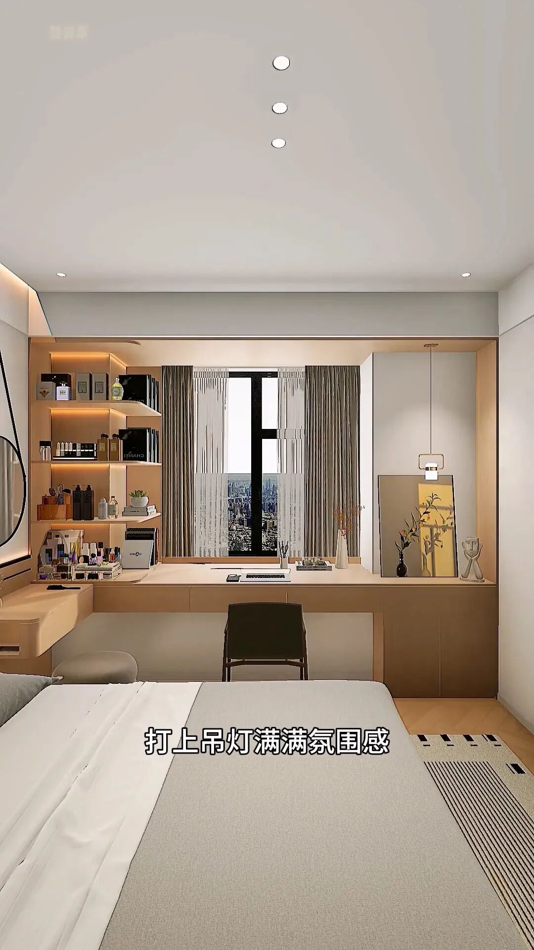 包墻垛定制雙面柜,收納書籍和化妝品,飄窗另一邊延伸地柜,大件雜物放這里,四周滿做木飾面,最后打上吊燈,氛圍感角落不就完成了嗎