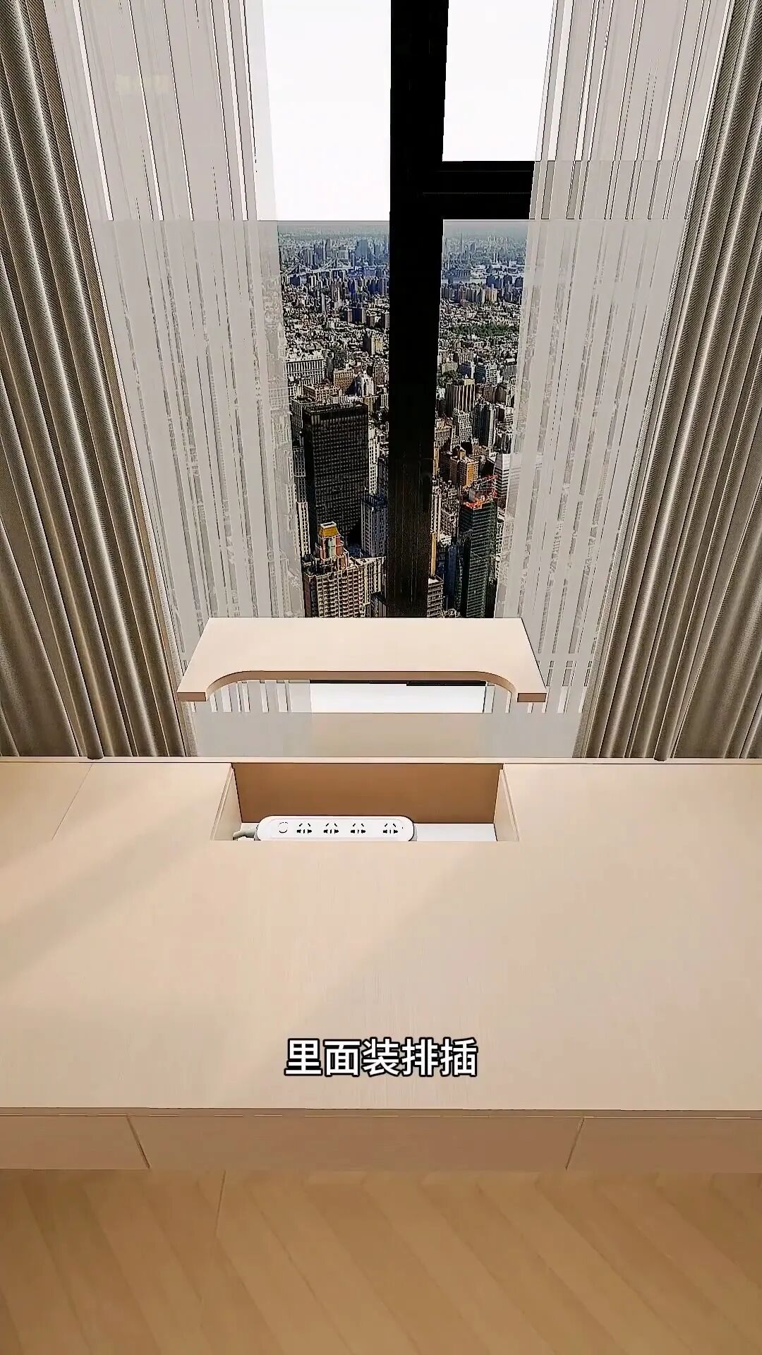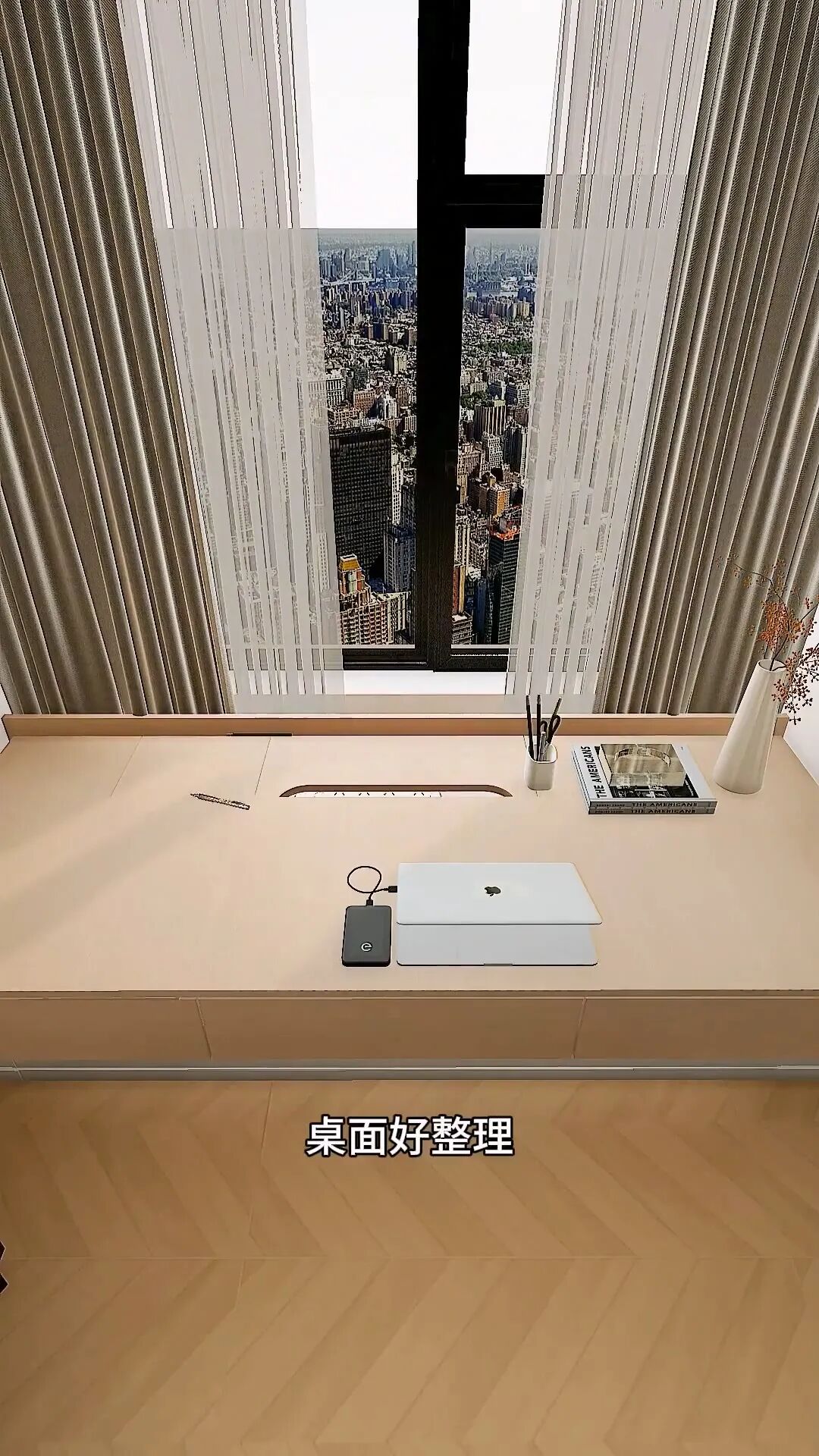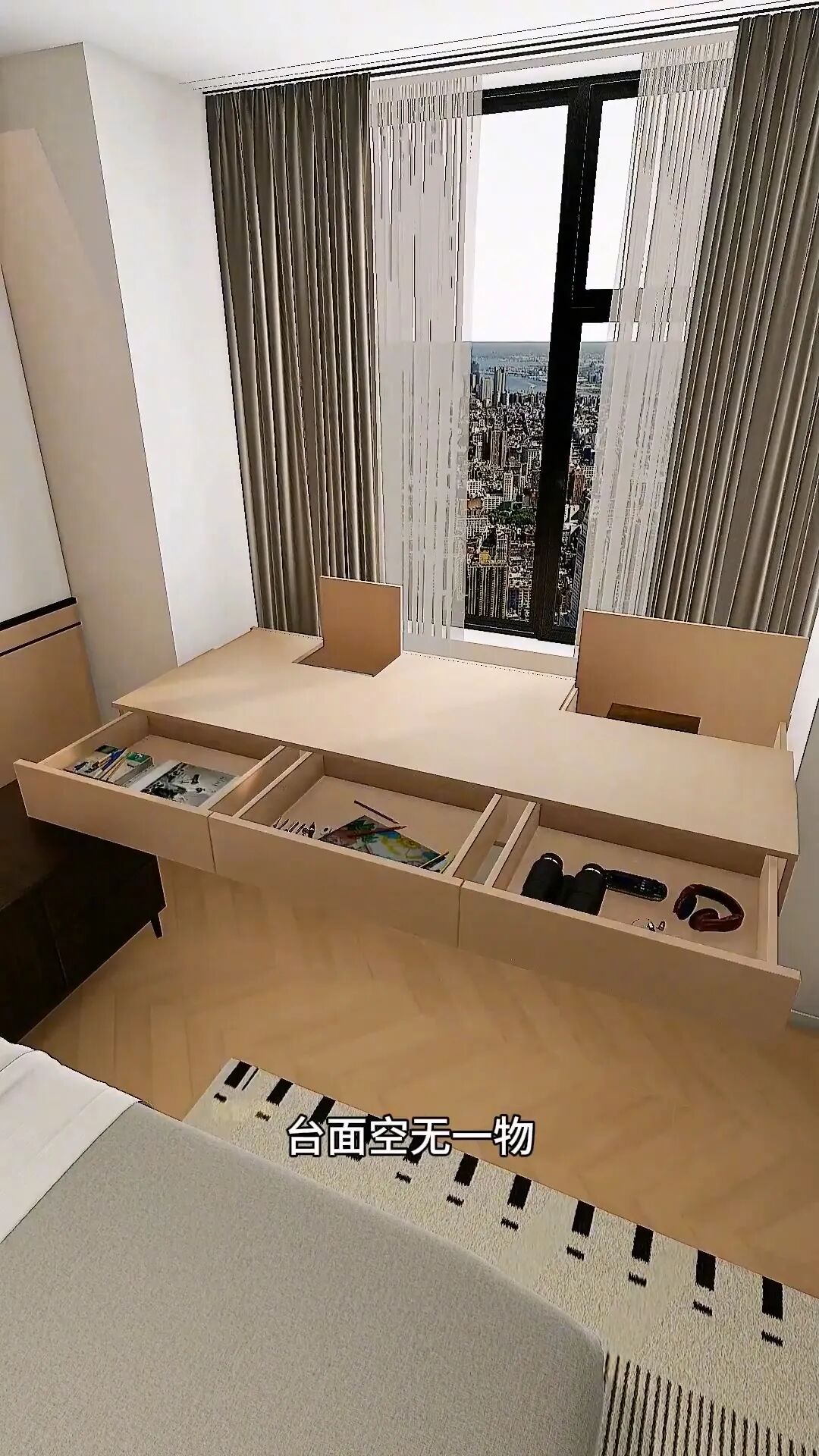延伸飄窗做書桌,上翻下拉都能儲物,臺面空無一物,端頭留線槽,里面裝排插,耳機、充電線等全隱藏在里面,干凈利落